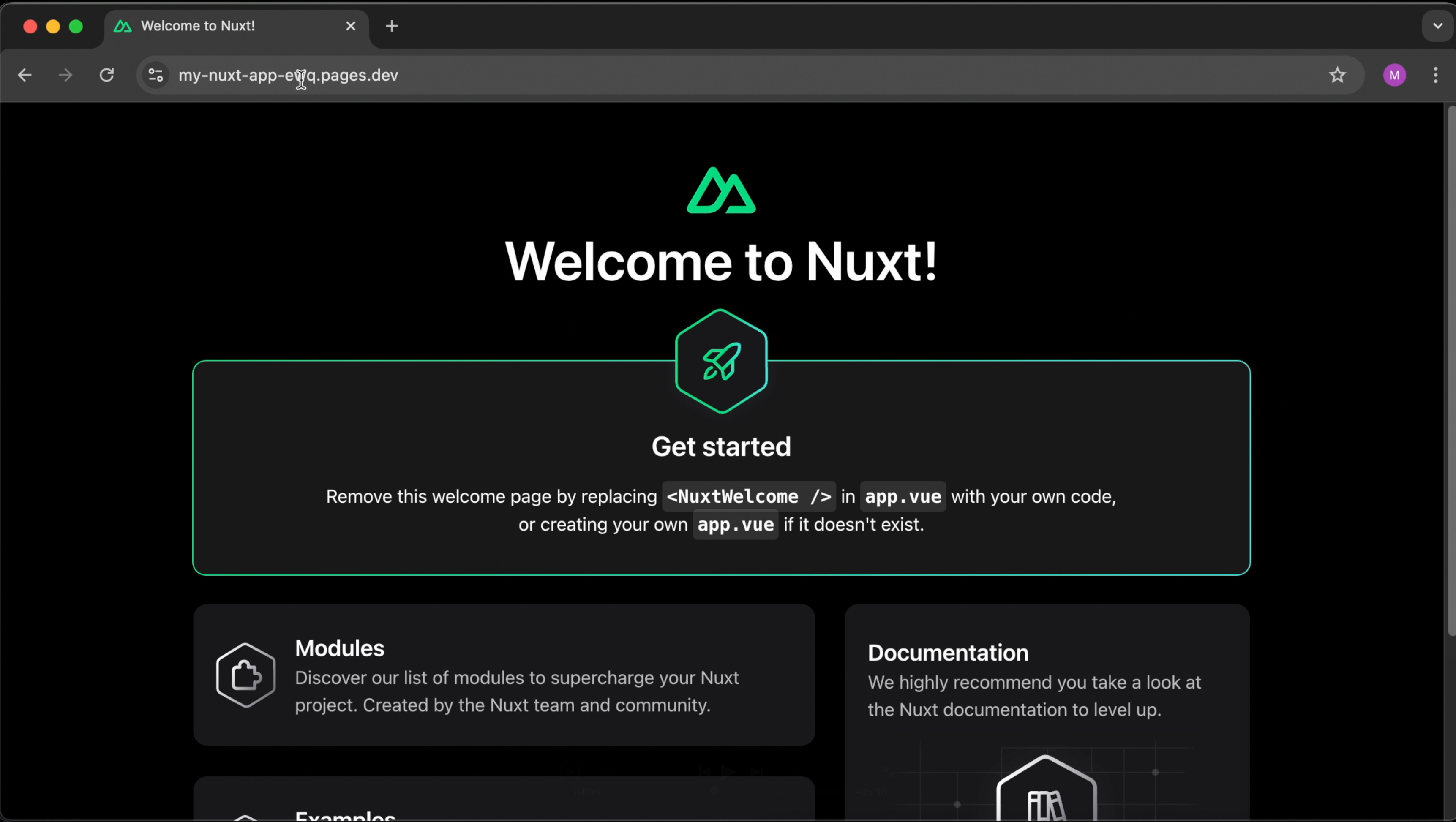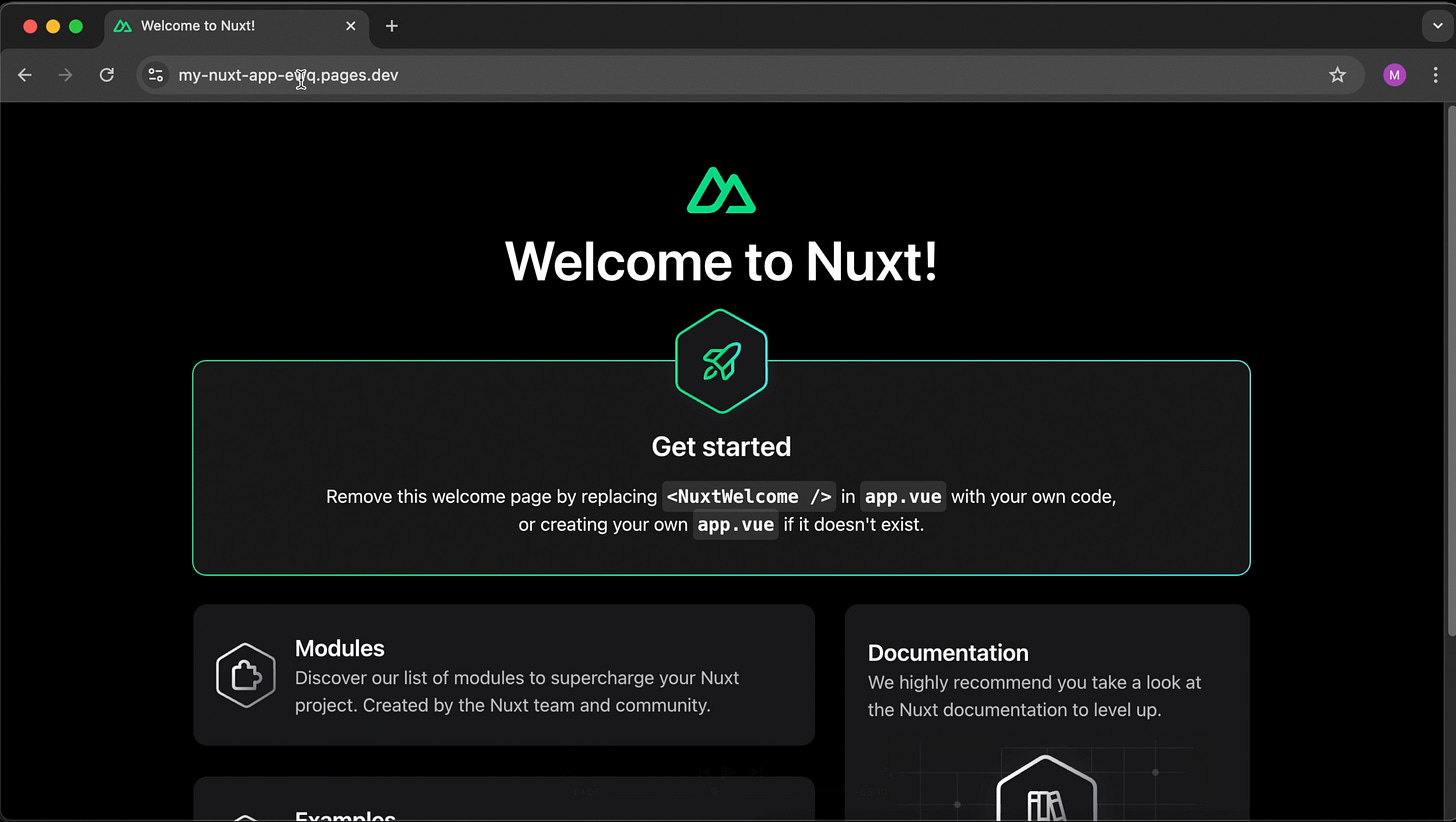 Nice, you’ve just deployed your first Nuxt application to Cloudflare Pages. Now you can open your deployed app in your browser, by clicking the url shown in your terminal.