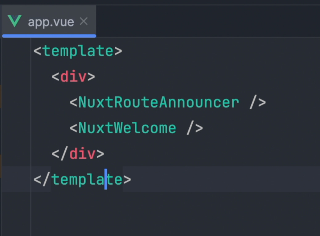 The HTML contains only 2 example components, <NuxtRouteAnnouncer>and <NuxtWelcome>.